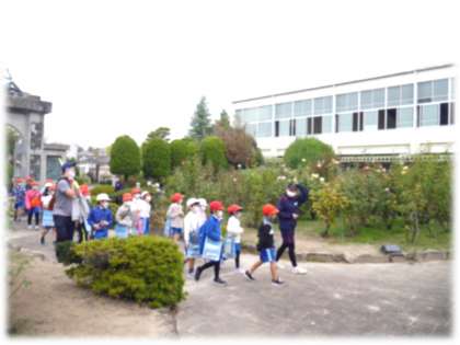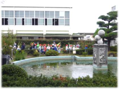 小学校に比べてずいぶん大きい校庭、薔薇園などを探検しました。薔薇園を目前に、「早く入りたいな」「でっかい池がある!」との小学生の歓声に、引率した2年生の温かい笑顔が印象的でした。