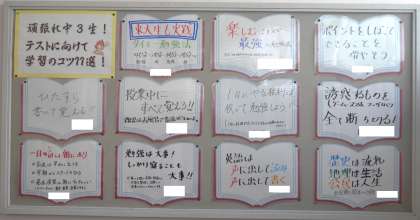 3年生階段掲示版は一新されました。登校時、気づいた生徒も多く、足をとめて見入る姿も見られました。今回のテーマは、ずばり「学習のコツ 11選」学年部の教員から3年生に向けてのメッセージです。