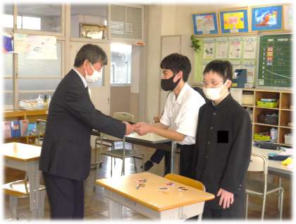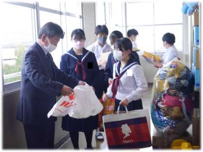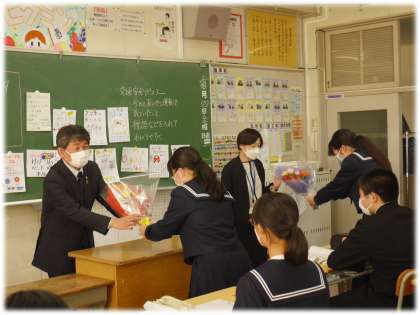 3年生が作った薔薇の花束に喜んでくださったり、一緒にリサイクル品の片づけを行ったり、特別支援学級で作った薔薇のしおりを興味深そうに見てくださったりしました。教育長の気さくな人柄に、生徒たちも自然と笑顔いっぱいになりました。