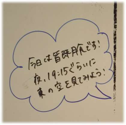 今晩は、442年ぶりの天体ショーが観測できそうです。そんなどきどきわくわく感もこめて、ある学級では、休み時間に皆既月食についての話題で盛り上がっていました。
