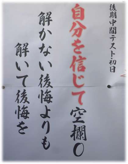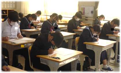 3年生のみ、9教科に取り組む後期中間テストのため、1・2年生より1日早く、後期中間テストが始まりました。この日に自分の力を最大限発揮するための取り組みを続けてきた3年生です。初日の今日も、「入試を想定した自分の姿」を思い描きながら、目の前のテスト問題に臨んでいました。