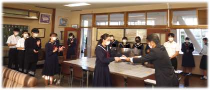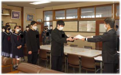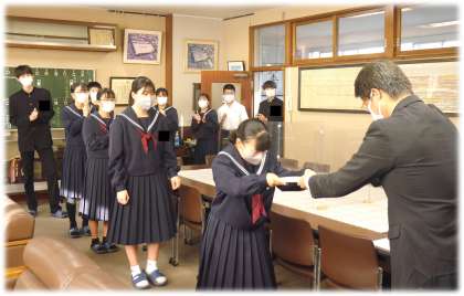 祝日明けの今朝、3年生の10月分のクリーンアップ賞・グッドマナー賞の表彰が校長室で行われました。