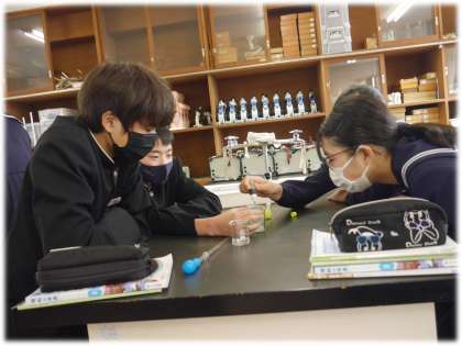 塩酸と水酸化ナトリウム水溶液を混ぜた液の性質を実験を通して確かめていきます。色の変化を確かめながら(他の班のものとも比較しながらの姿がほほえましいです)、実験を行う生徒たちの興味津々の表情。最後は、水溶液を蒸発させて得られた物質の正体に迫ります。さあ、どのような考察にたどりついたのでしょうか。
