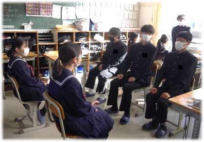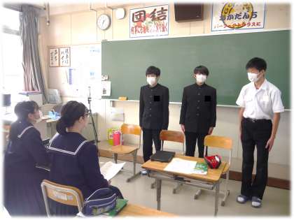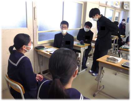 3年生の教室から、はきはきとした声が聞こえてきました。のぞいてみると、面接の練習が始まっていました。面接官と受験生とに分かれ、それぞれに互いにプラスになるように、実際の動きを確認しながら、気づいたことを伝え合っています。