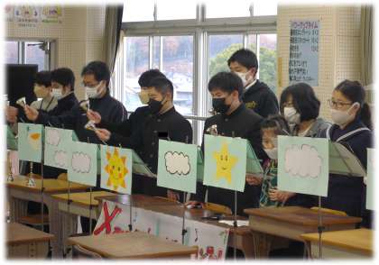 1校時の音楽の時間、特別支援学級の生徒たちによるクリスマスコンサートが開催され、これまでの音楽科の授業で練習を積み重ねてきたハンドベルの演奏を披露しました。
