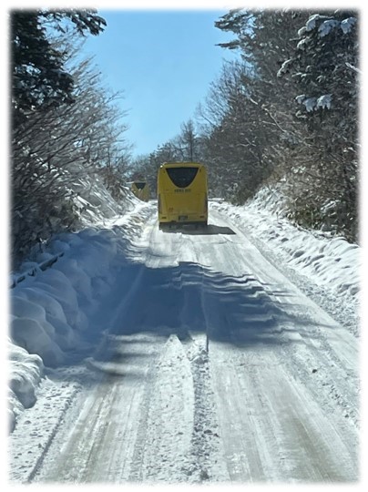 バスは、高山を走っています。すっかり雪景色ですね。