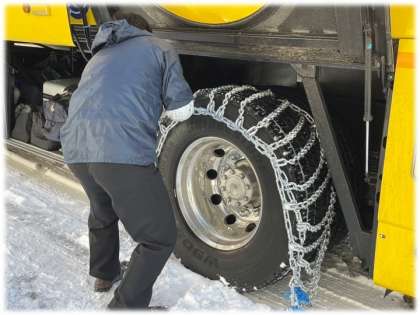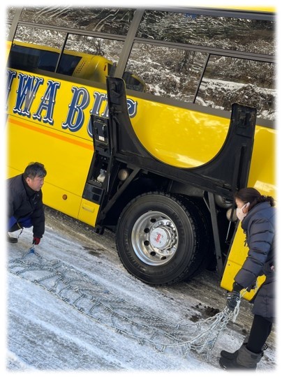 バスも、ダブルチェーンを装着です!運転手の方をバス内で、バスガイドさんと一緒に応援する2年生です!