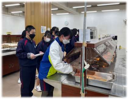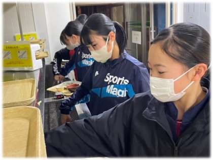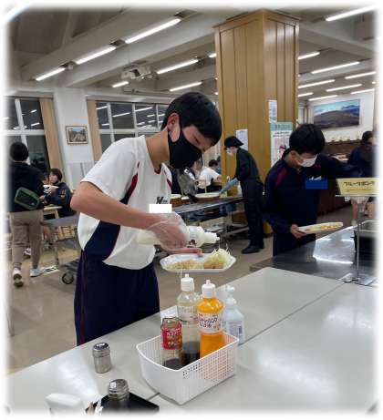 部屋班ごとにまとまって食堂へ移動し、自分の分を盛り付けていきます。