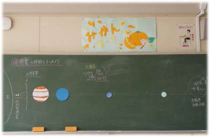 教室で惑星の位置や距離間を確認したのち、実際に校庭で体感します。新聞紙や画用紙で作った太陽や惑星の模型を持つ人が位置につくと、いよいよ宇宙旅行に出発!