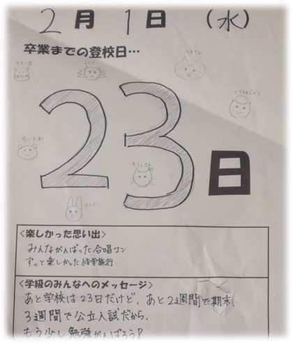 3年生の教室には、ずいぶん前から卒業までのカウントカレンダーが掲示されています。豊南中学校を巣立つ、そのときに向けて、一日一日これまでの自分たちを振り返り、思い出を共有しながら、仲間と過ごす日々を大切に過ごそうとする姿は愛おしく感じます。