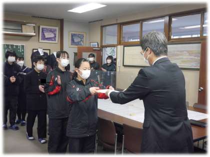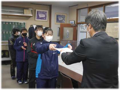 今朝は、1年生の1月分「クリーンアップ賞・グッドマナー賞」の表彰が校長室で行われました。