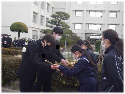 今朝は、3年生が後輩である2年生に向けて、その活動を引き継ぐセレモニーが行われました。代表生徒からの後輩へ託す想いが語られたのち、黄金のほうきとちり取りの引継ぎがされました。