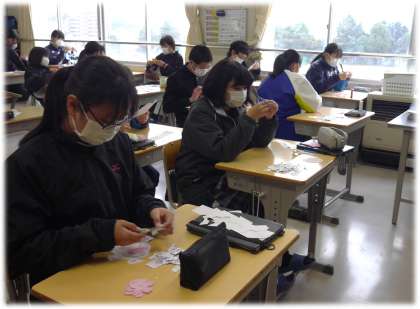 桜の花びらをていねいに切り取っていきます。個々の飾りが組み合わさって、どのような装飾になるのか、楽しみですね。