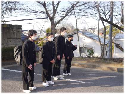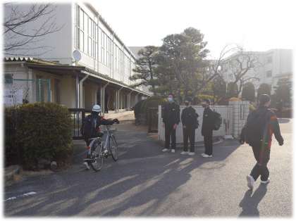 正門であいさつ運動を行う生徒たちの張りのある声が、青空に響き合う、心がほっこりする朝の風景です。元気のよいあいさつは、心を元気にしますね。