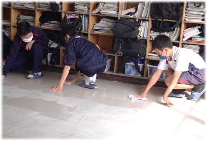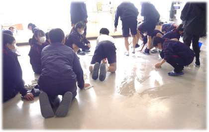 昨日の2年生に続いて、今日は1年生がワックスがけのための床磨きを学級全員で協力して行っていました。