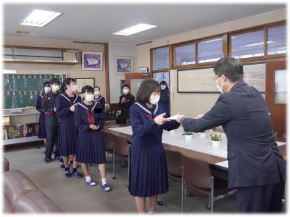 今朝は、校長室に1年生のすてきな返事が響きました。今年度を締めくくるグッドマナー賞、クリーンアップ賞の表彰です。