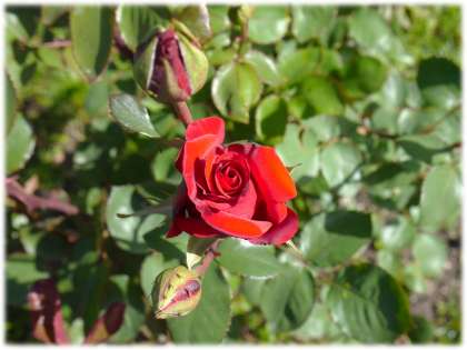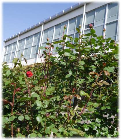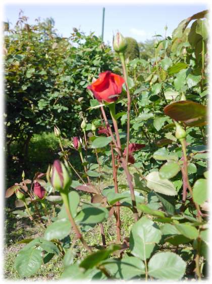 体育館寄りの薔薇園で、一輪の真っ赤な薔薇が開花しました。周りのつぼみもふくらんでおり、今週は次々と開花の予感です。