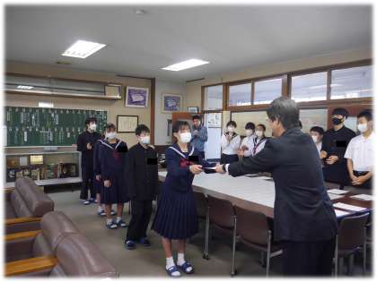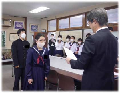 先輩や仲間に続けと、今の精いっぱいの返事で、校長先生から認証状を受け取ります。