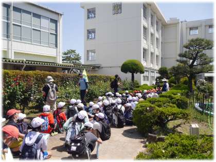平和小学校の5・6年生が地域探訪の一環として、豊南中学校の薔薇園を訪問しました。例年より早く咲き誇っている薔薇園に、小学生たちの目も輝きます。