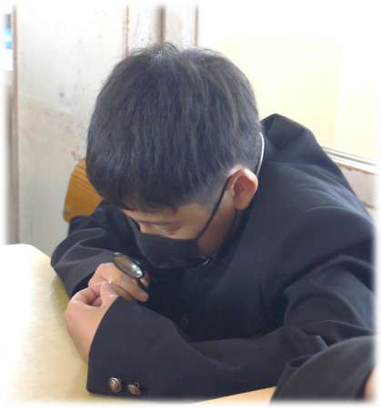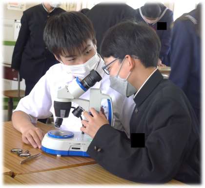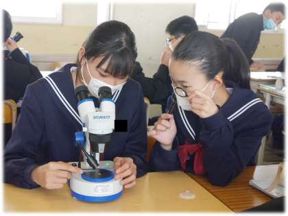 植物の観察の授業では、ルーペや双眼実体顕微鏡を使って、タンポポの断面の観察を行っています。実際に、花弁やがく、おしべ、めしべなどのつくりを観察を通して確認していきます。