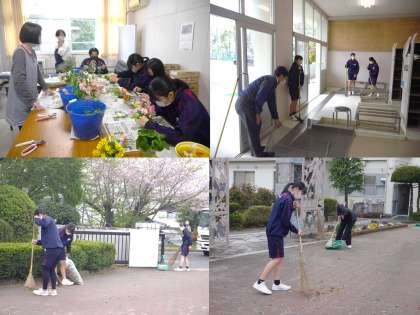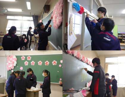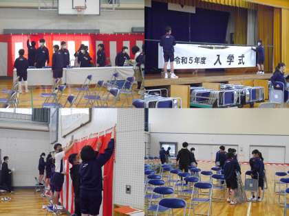 翌日の入学式・始業式を控え、新1年生を迎えるために、一生懸命準備を行う頼りになる3年生の姿です。