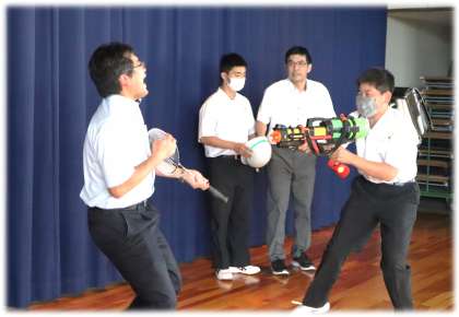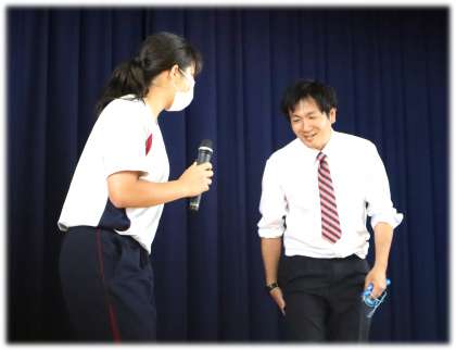 続いては、1年生に豊南中の先生方の魅力を伝えようと、クイズ形式の先生紹介です。