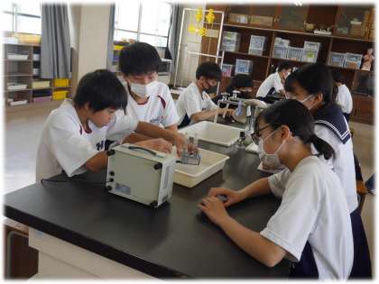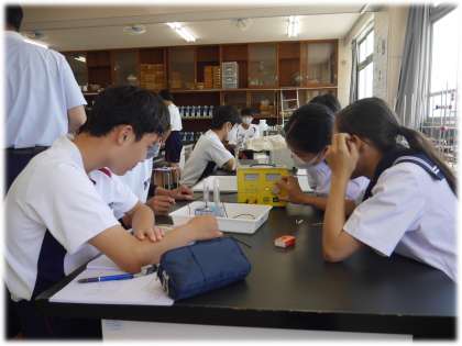 電気による水の分解について、電解装置を用いての実験に取り組んでいます。