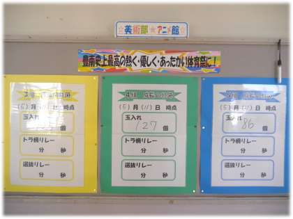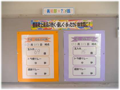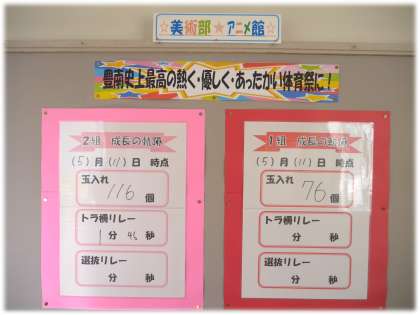 学年掲示板には、各学級の体育祭への取り組みが、「記録の見える化」で共有されています。そのタイトルは、ずばり「豊南史上最高の熱く・優しく・あったかい体育祭に!」