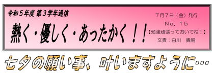 夏休みまであと少しになりました。今年の夏休みは部活動で3年生と会えなくなるので、なんだかさみしいなぁと思ってしまいます。その分、夏休みまでの毎日をしっかり楽しんでいこうと思います。