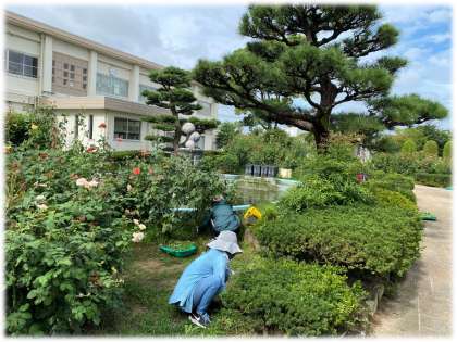 今朝は湿度が高く、立っていても汗がじわりと出てくるような天候でしたが、午前8時から、薔薇園や中庭周辺の草取りを一生懸命に行ってくださいました。日常では、生徒が朝清掃ボランティアや通常清掃の時間で、また校内整備員や公務手の方、校務主任、また地域学校共働本部の本部長などの力をかりて整備を進めていますが、夏場はなかなか追いつかないのが現状です。こうして、育友会中心に整備にお力添えをいただき、本当にありがたいです。