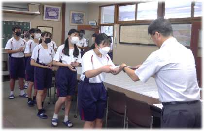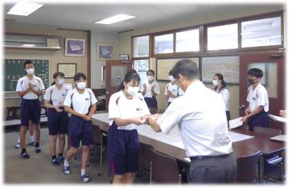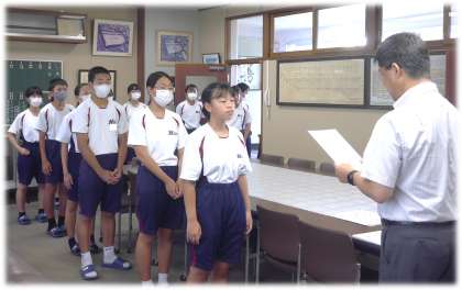 校長室では、2年生の6・7月のクリーンアップ賞、グッドマナー賞の表彰が行われました。こちらも、暑さを吹き飛ばす元気のよい返事の声が響きました。めりはりをつけて、行動できる姿に頼もしさを感じます。