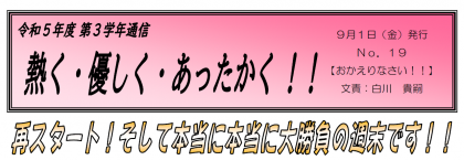 さて、来週は期末テストです。とても大事なテストです。ご家庭でもぜひ背中を押してやってください。「今までで1番頑張れた」と思えるように土日を過ごせるといいなと思います。タイガースにも頑張ってもらいたいです!!
