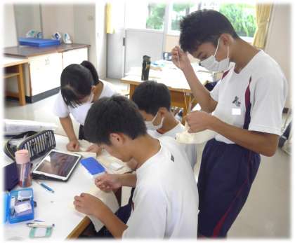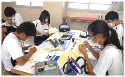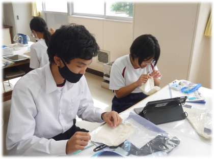 今日は、内ポケットにスナップを付ける段階です。教科担任の説明を聞き、作業開始。スナップ付けの方法を、友達同士で教え合ったり、学習用タブレットの動画で確認を行ったりしながら、意欲的に製作に取り組んでいました。完成が楽しみですね。