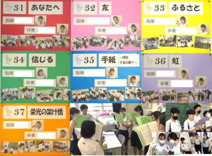休み時間になると、どこからともなく合唱の練習が始まる姿が3年生のフロアに見られます。学級内では互いのパートごとの歌声が、また学級間では、各学級での練習の熱量が、それぞれに高め合う刺激となっているようです。