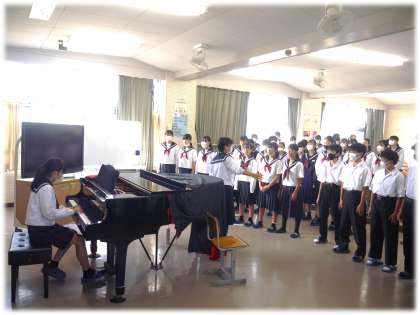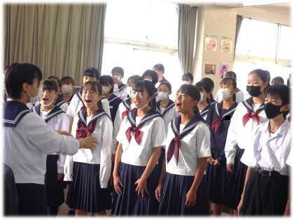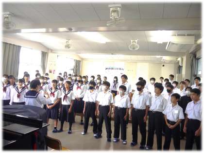 歌声に誘われるように音楽室に集まってくる1年生。2年生の歌声を聴きながら、「自分たちも」と、元気いっぱいに学年合唱を歌いあう1年生のよさが歌声に表れています。