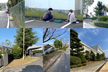 日常の清掃活動や生徒ボランティア等では追いつかない校地内の草刈りを1時間30分程度の時間をかけて、ボランティアの方が一生懸命にきれいにしてくれました。草刈り機を持参してくださったり、軽トラで段取りよく刈った草を集めたりと、ボランティアの皆さまのチームワークが抜群でした。おかげさまで、雑草まみれであった箇所が、見違えるほどきれいに整えられました。