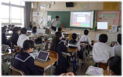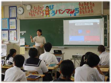 生徒たちは、時間内に学習用タブレットで解答します。すかさず、全面スクリーンに学級の集計結果が表示されます。そして、教科担任のやさしく、気合いの入った解説が入ります。
