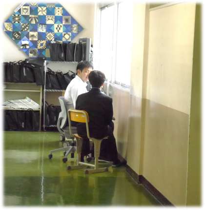 担任が学級の生徒一人一人から話を聞ける貴重な時間です。限られた時間ですが、生徒の思いを受け止めながら対話を進める担任たちです。