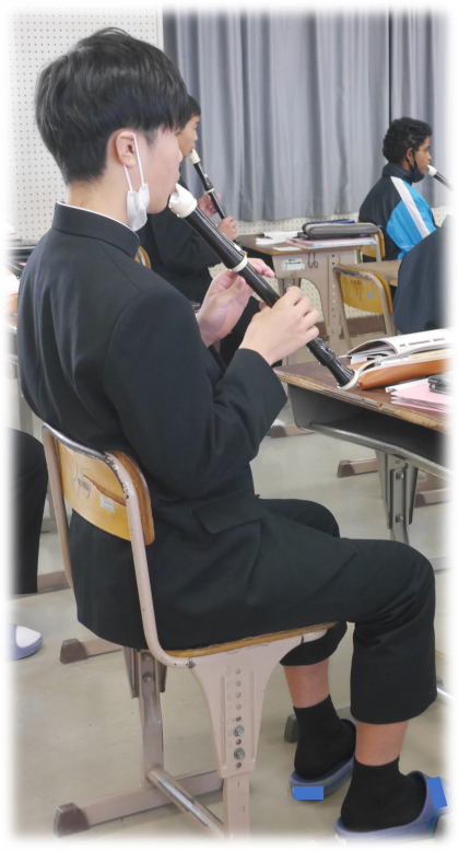 アルトリコーダーの音色に魅かれて音楽室をのぞくと、2年生が始めたばかりのアルトリコーダーの練習に集中して取り組んでいました。