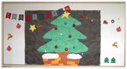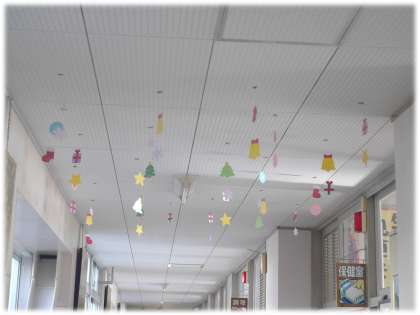 天井には、12月らしい飾りがゆらゆらと揺れています。また、掲示版には、養護教諭と生徒たちが一緒に制作したクリスマスツリーが飾られています。実は、ちぎり絵なんです。心がこもっていますね。