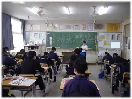 本時は、1時間目ということで、課題の「笑門来福」の一文字一文字について、教科担任がていねいに書き方のポイントを説明しています。生徒たちも自分の手本にポイントを書き込みながら、書くイメージを膨らませていました。