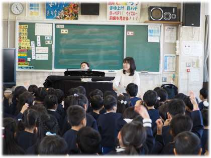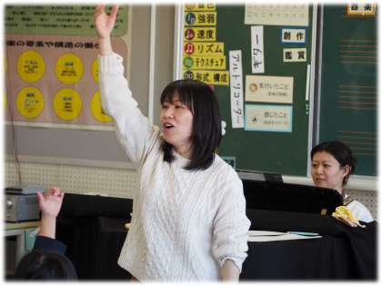 今日は、本校の音楽科教員から歌のレッスンを受けたいと、大和幼稚園の園児たちが豊南中学校を訪れました。