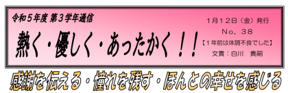 冬休みが明けて一週間がたちました。3年生は、明るい表情でたくさん話しかけてくれました。来週はいよいよ本格的に入試が始まります。誰かの合格をみんなで祝福したいと思います。入試に向かうみんなが、週末を健康に過ごし、本番で今まで積み上げてきたものを発揮できるよう願います。2年生は自然教室に出発します。一年前は体調不良だったことをしみじみと思い出します。