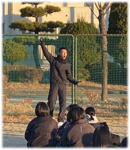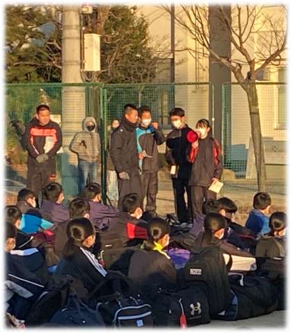 氷点下となった今朝、豊南中学校の運動場だけは自然教室に臨む生徒たちの熱気で包まれていました。