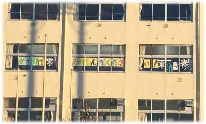 美術室窓に掲示された特別支援学級の1・3年生が心をこめて作成したメッセージ、出発式を見守ってくださった多くの保護者の方、部活動で登校していた1年生、そして教員の見送りを背に、バスは一路、乗鞍青少年交流の家を目指して出発!