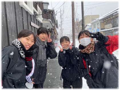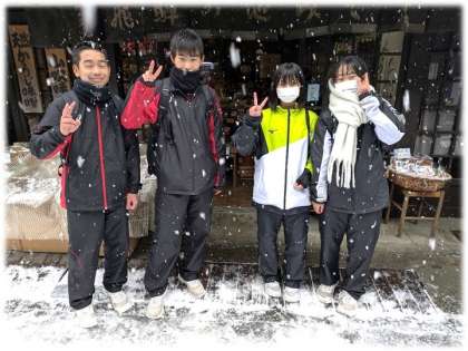 ぼたん雪がしんしんと降り注ぐ寒い中ですが、2年生は元気よく仲間と散策を楽しんでいます。