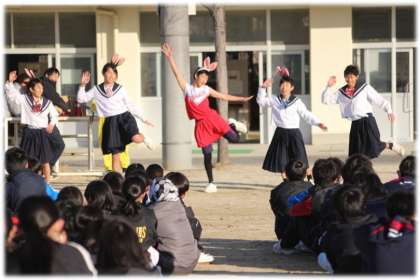 まずは、運動場で思いっきり身体を動かします。実行委員の盛り上げダンスで一気に学年みんなの心のやる気スイッチが入ります。