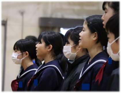 そして、学年合唱で想いを一つに歌い上げます。体育館中に、1年生のやわらく、でも力強い、互いに響き合う声が重なりあっていきます。