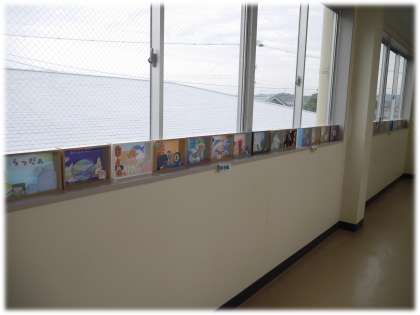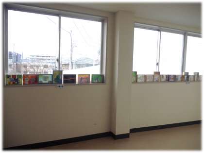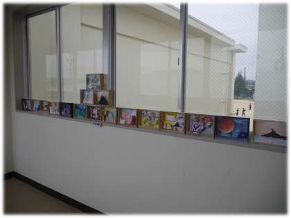 第2美術室に向かう廊下に、3年生の中学校生活の思い出を表現した作品が展示されています。どのような一場面を切り取ったのか、思わず足をとめて見入ってしまう作品ばかりです。