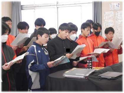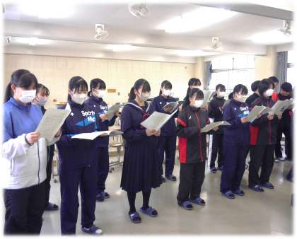 卒業式で歌う歌の練習に取り組んでいました。これまで音楽の授業で学んできたことを土台に、後輩たちとともに歌うからこそ、「自分たちが後輩たちに示せるもの、残せるもの」を考え、歌詞に想いをのせる歌い方を追究しています。その姿を見るだけで、胸にぐっとこみ上げるものがあります。